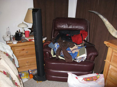 The floor, chair and most surfaces were filled with clothing, bags, pillows, and other items. It didn’t take long to turn this chaotic bedroom into a restful and calm space.