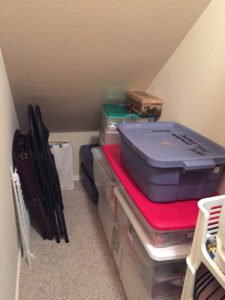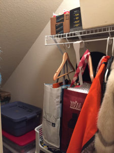 This Under the Stairs storage area was a jumble to things thrown in and there was no room to move around. It was used mainly to store home décor items and holiday decorations. The wire rack to hang coats and jackets only needed minor tweaking. Everything else in the closet was hauled out to sort and reorganize. There is now room to walk around.